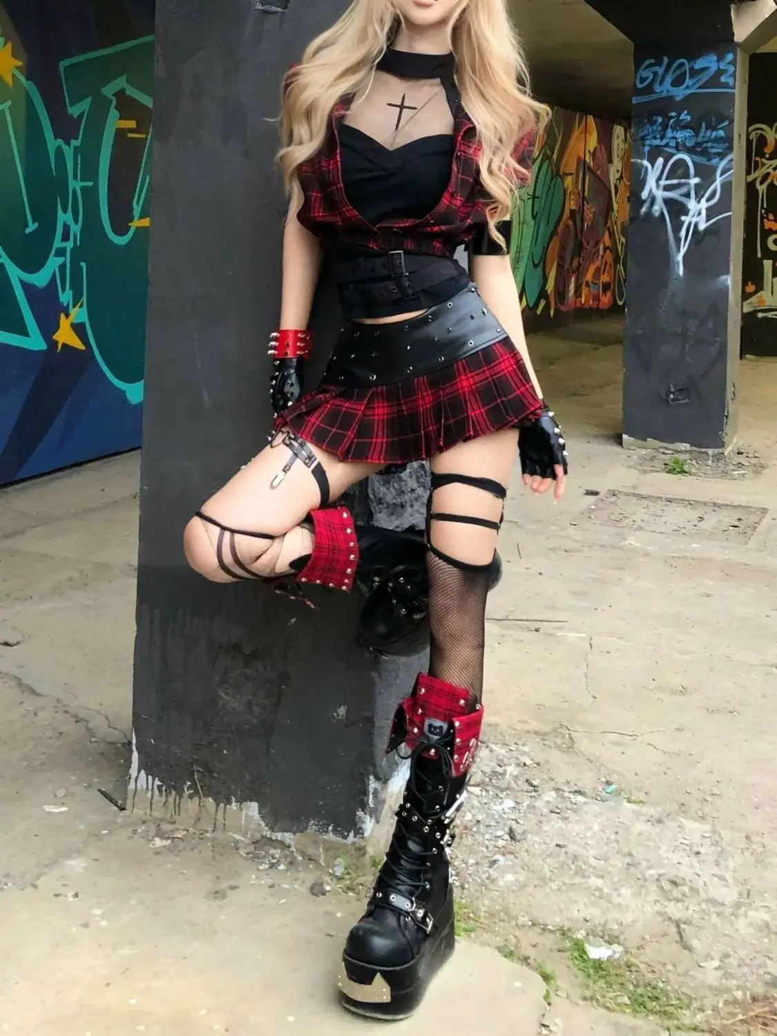 Goth Punk Plaid Two Piece Set Women Red Black Short Sleeve Crop Top Mini Pleated Skirt Belt Gloves Straps Streetwear Outfit 2025