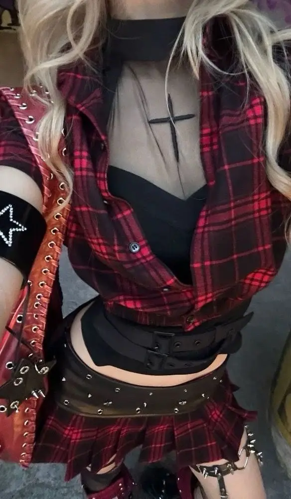 Goth Punk Plaid Two Piece Set Women Red Black Short Sleeve Crop Top Mini Pleated Skirt Belt Gloves Straps Streetwear Outfit 2025 Beauty hair & fashionfj