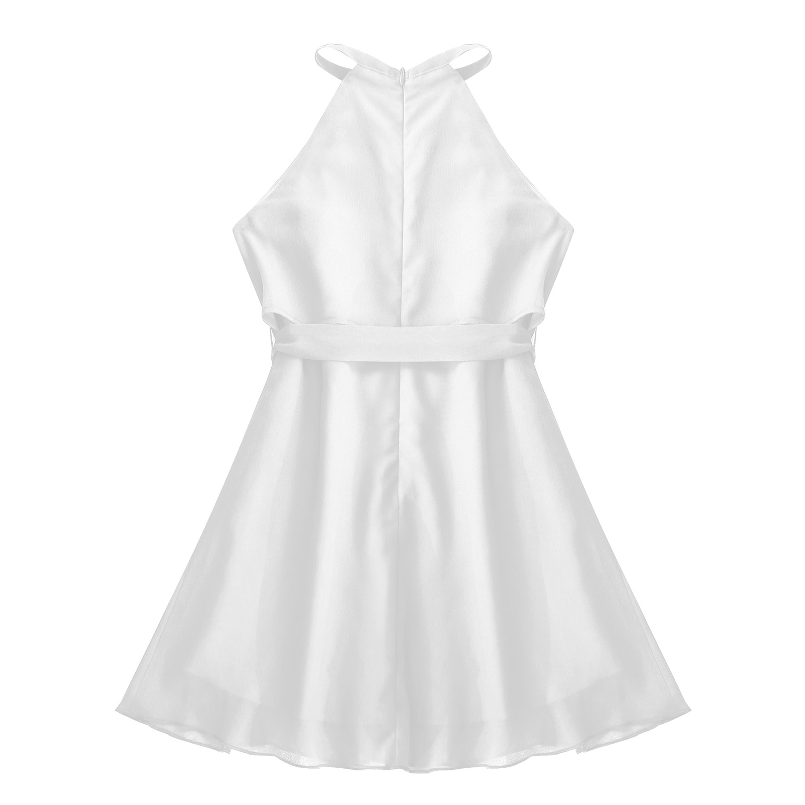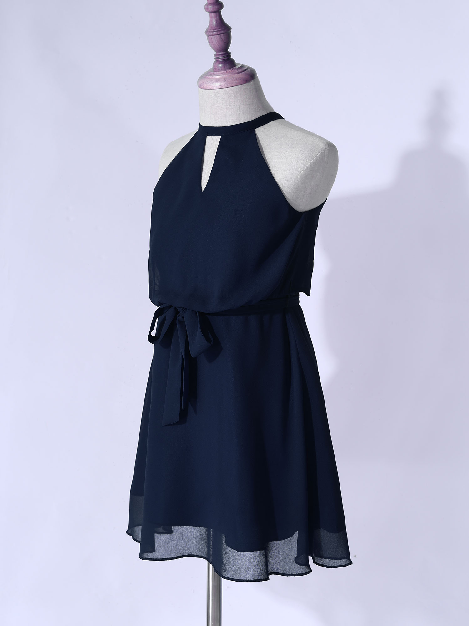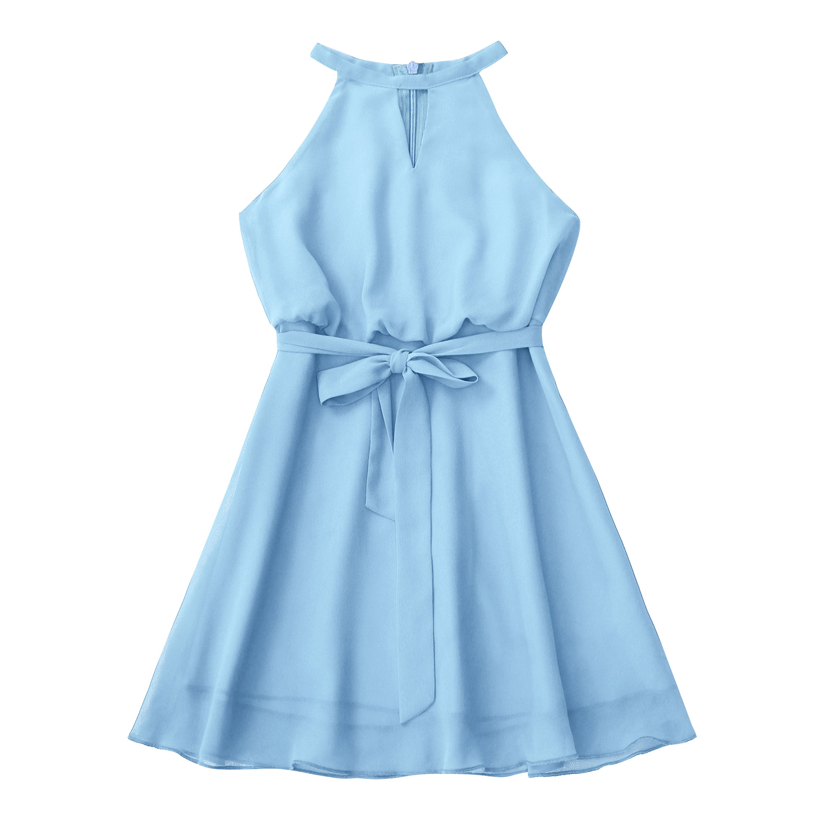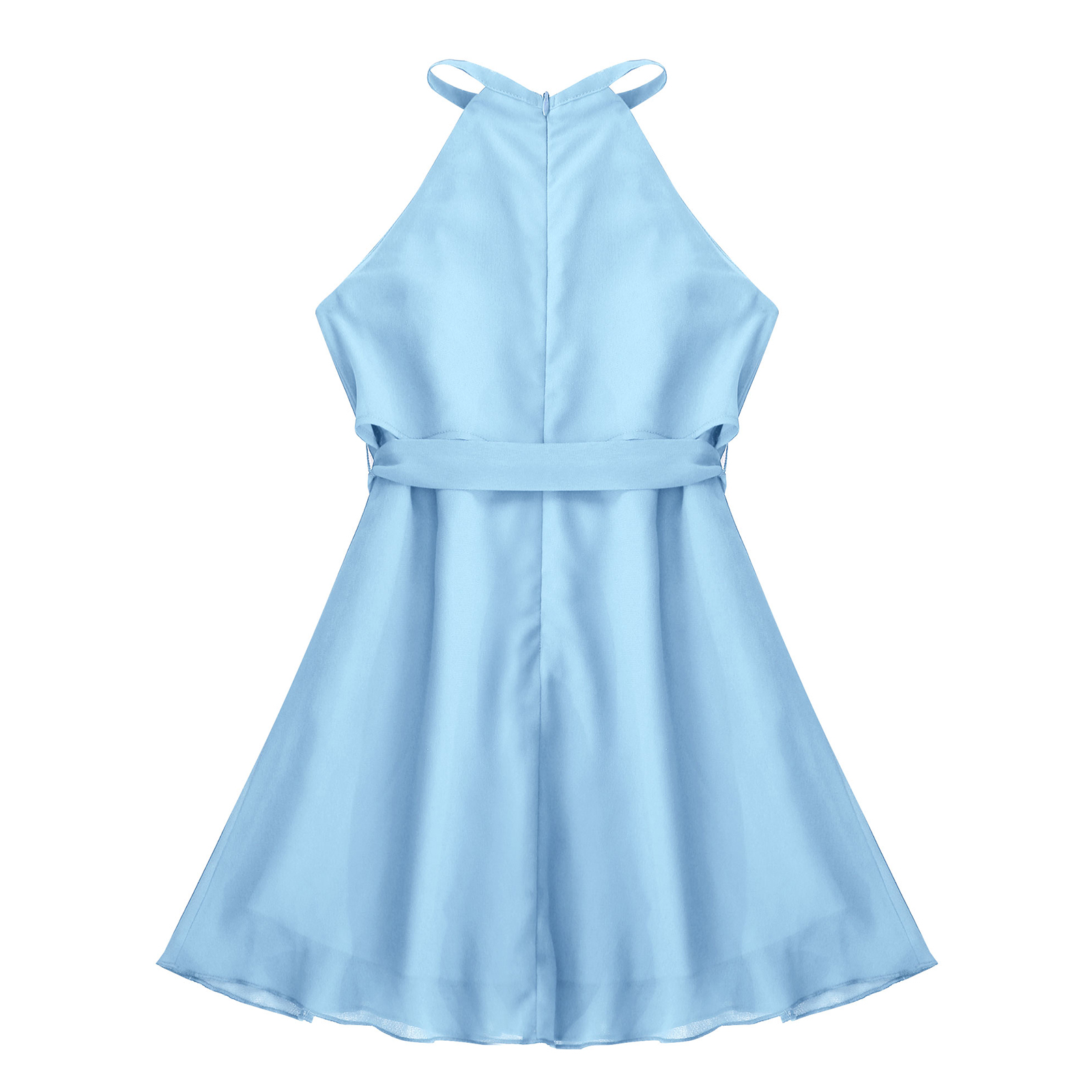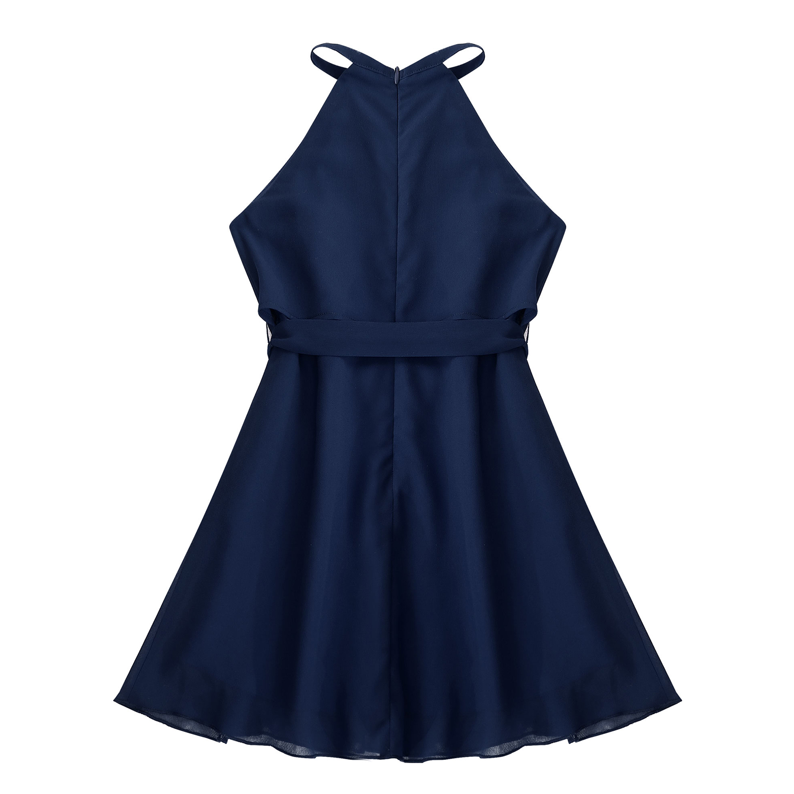 Kids girls flowing chiffon dress halter sleeveless high waist fully lined big girl dress for party wedding prom.