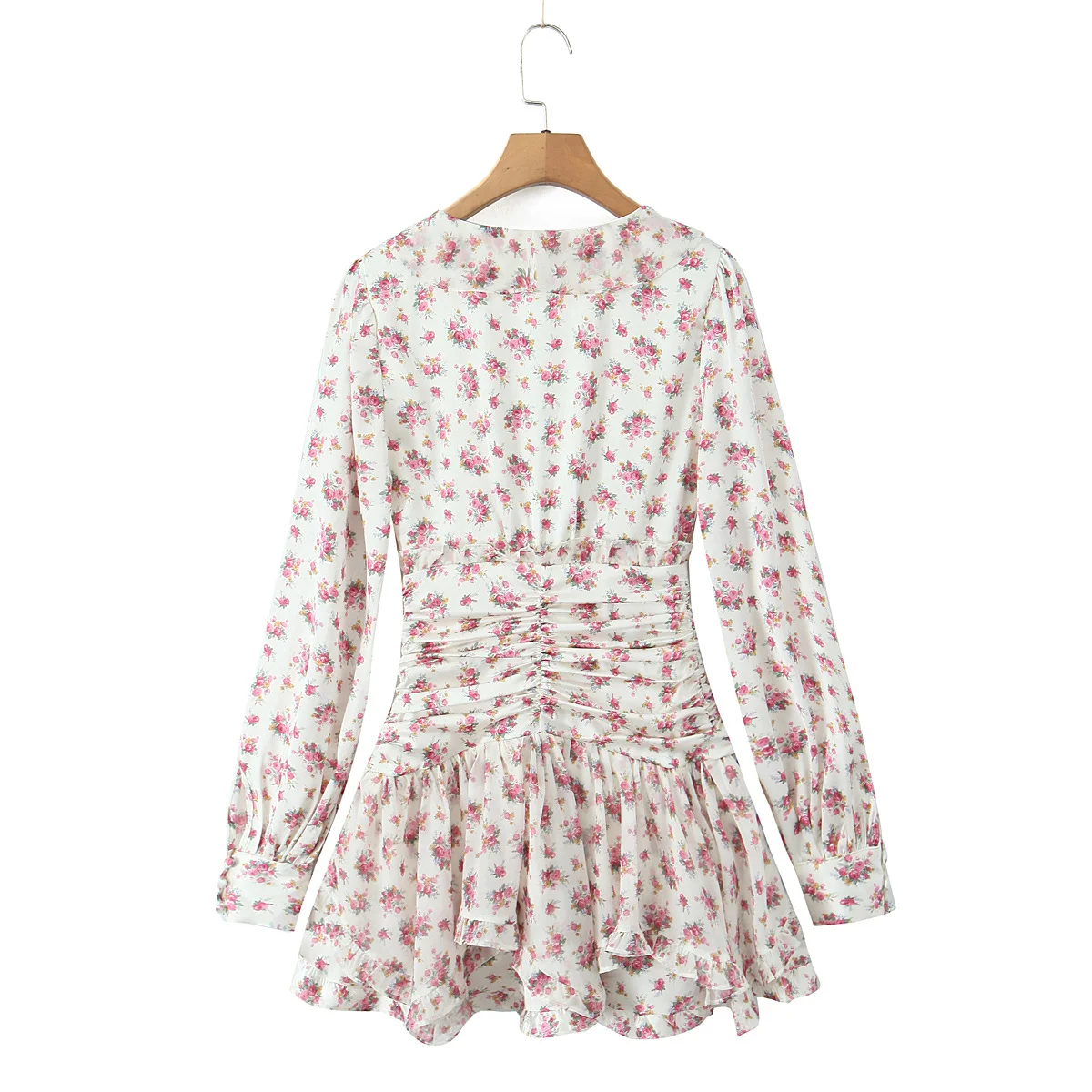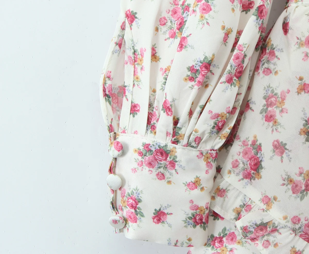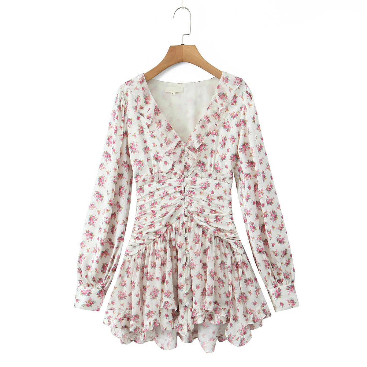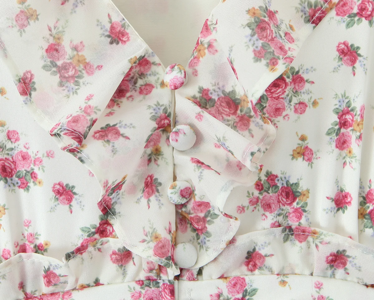 Spring 2025 Women Sweet Floral Print Ruffle Mini Dress Front Button Long Sleeve V Neck A-