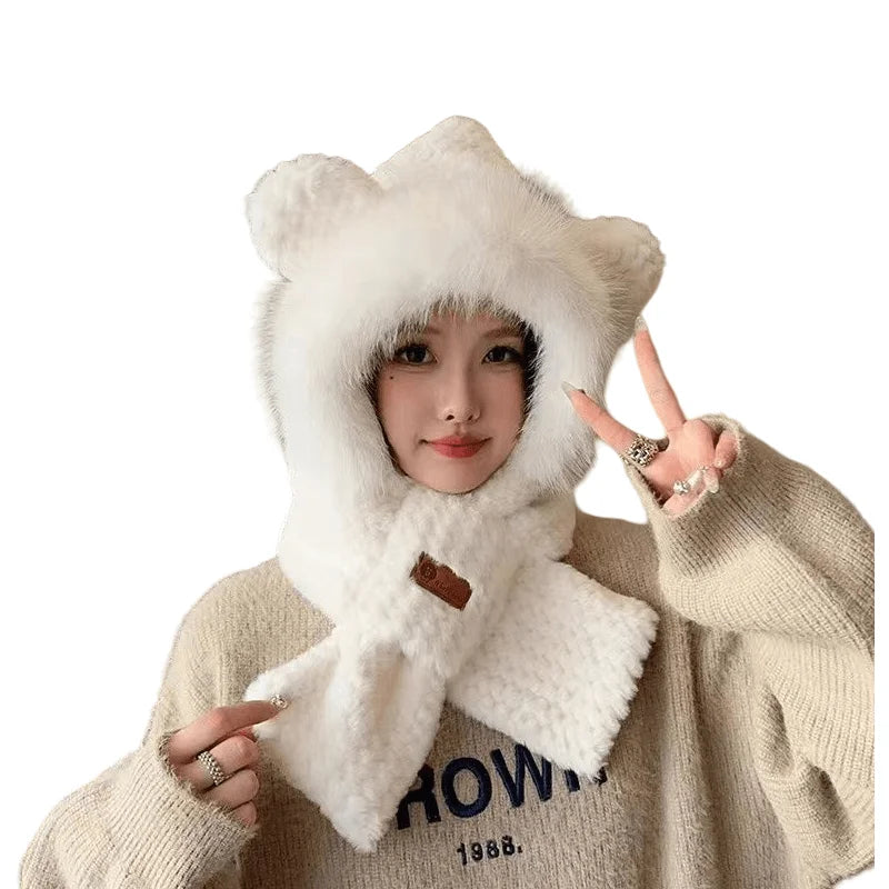 New Winter Plush Bear Neck Warmer Hat for Women Windproof Ear Warmers Thickened Female Cycling Versatile Hats and Scarf Set 2