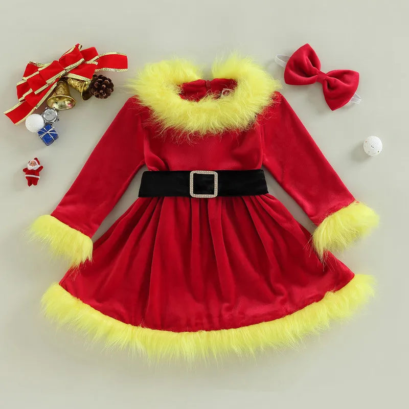 Christmas Baby Girl Clothes Party Dresses Long Sleeve O Neck Plush Patchwork A-line Dress with Belt and Headband Baby Clothing