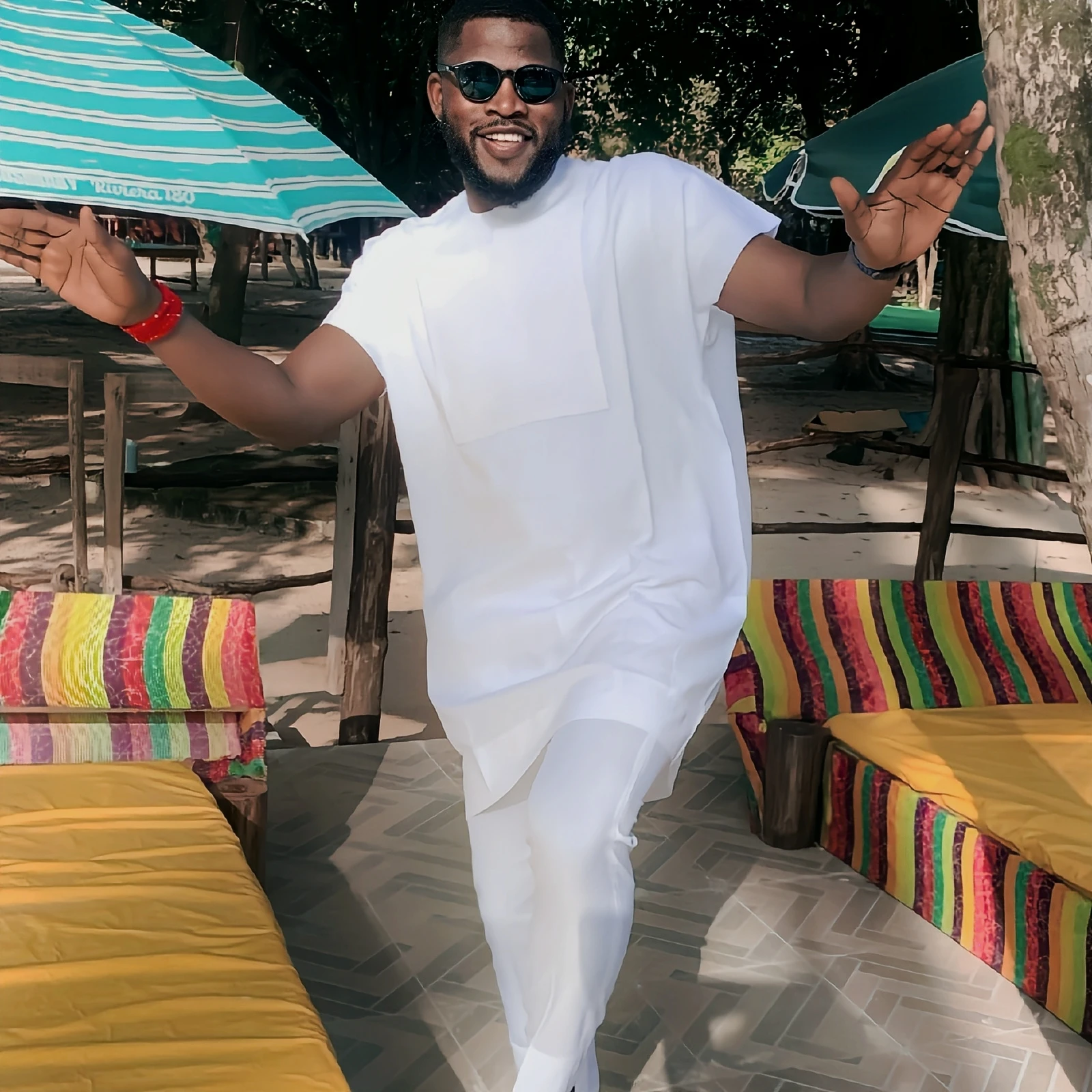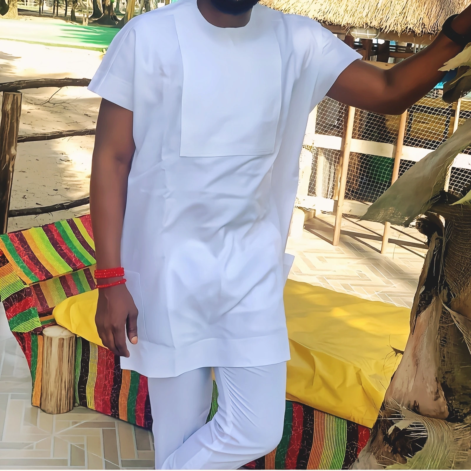 New Arrivals African Fashion Solid White Men's Cotton Pant Suits Short Sleeve Tops+Casual Trousers Custom Nigerian Style Garment