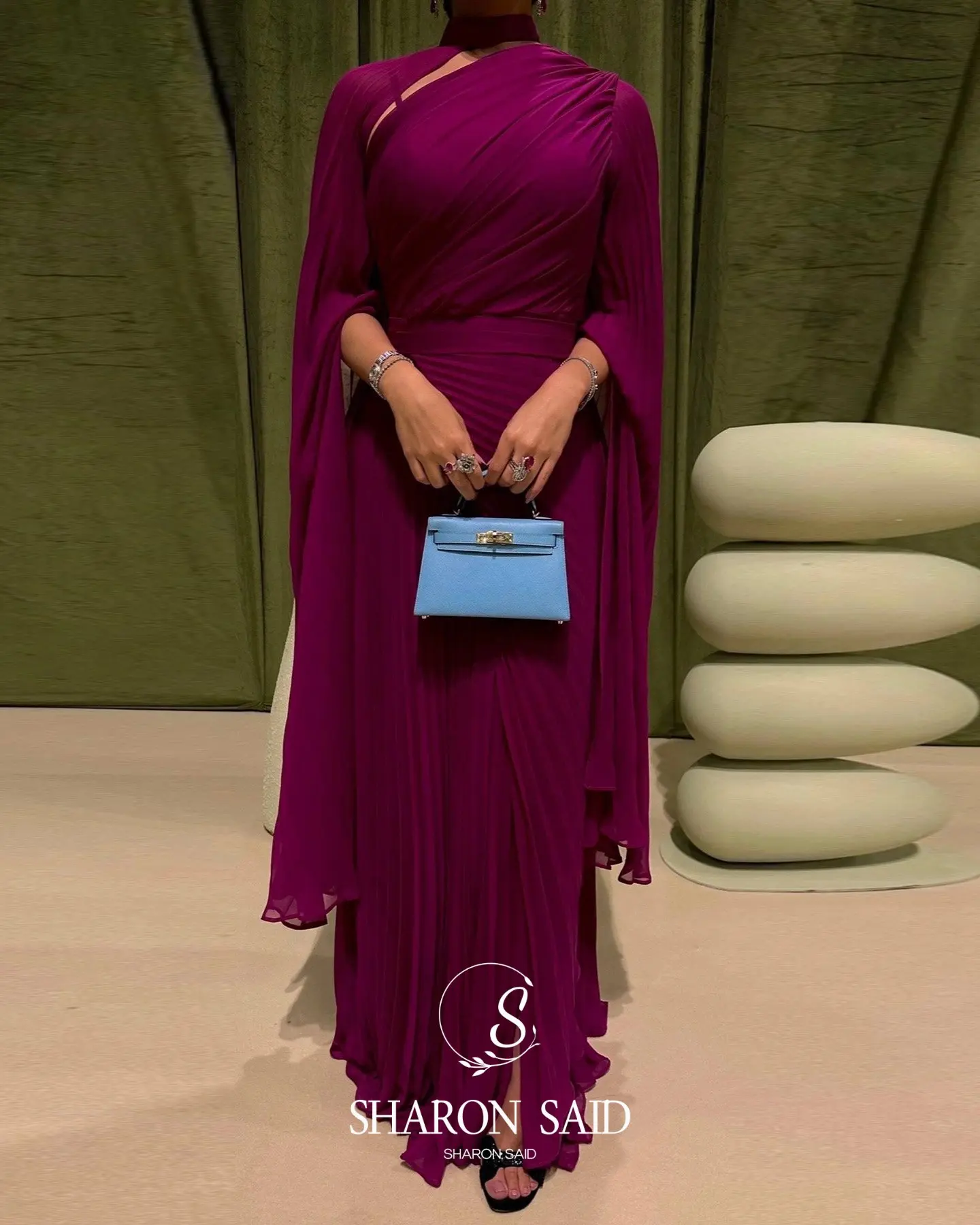 Sharon Said Dubai Fuchsia High-Neck Evening Dresses with Chiffon Long Sleeves for Women Wedding Formal Gown SF085 Customized