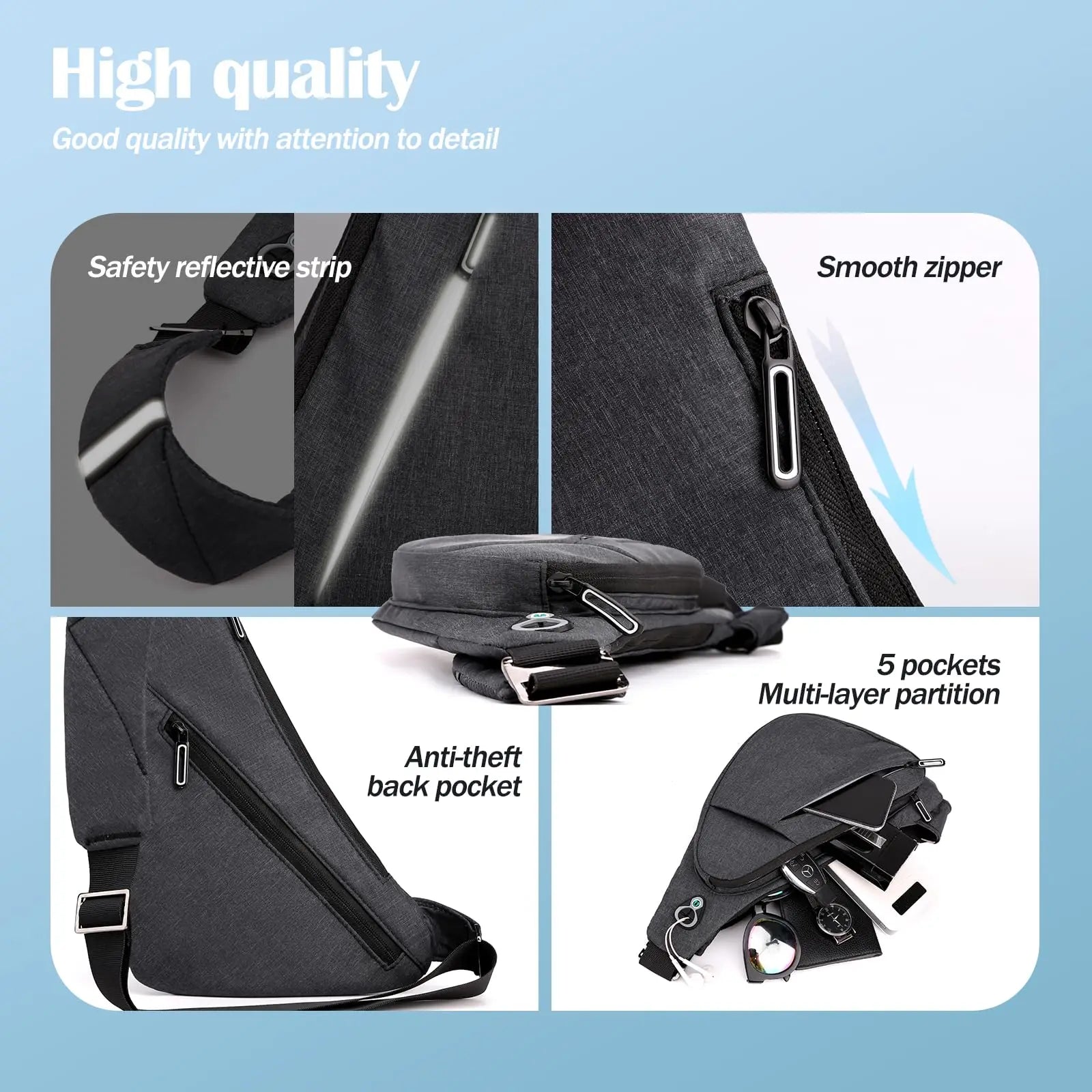 【High quality materials】- Crafted from lightweight, water-repellent nylon, this one-strap shoulder sling bag boasts top-quality zippers, reinforced padding, and reflective strips for added stability and security. Comfortable to the touch, easy to clean, safe and durable, ideal for travelers.