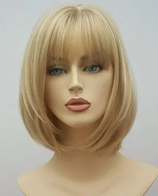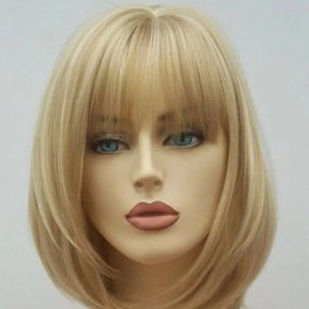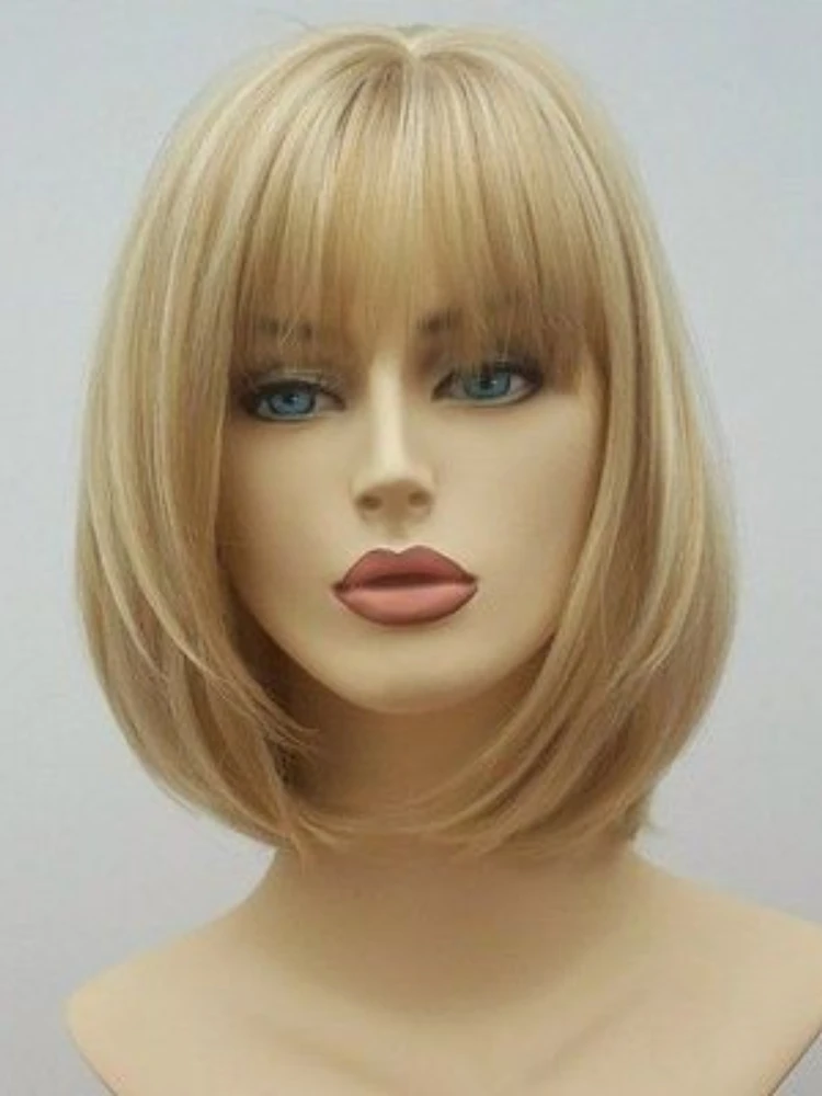 Women Bob Blonde Straight Short Bob Hair Flat Bangs Women Synthetic Wigs Blonde HighLights Hair Wig Heat Resistant Fiber